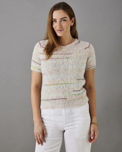T-shirten strikkes rundt oppe fra og ned med sadelskulder i glatstrikning og udtagninger i halskanten....