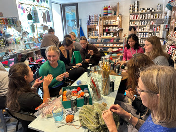 Hver tirsdag og torsdage forvandler vi butikken til en oase for strikkere og hæklere. Her er ingen spørgsmål for små, og vi hjælper hinanden, hvis en opskrift driller, eller en maske er tabt.